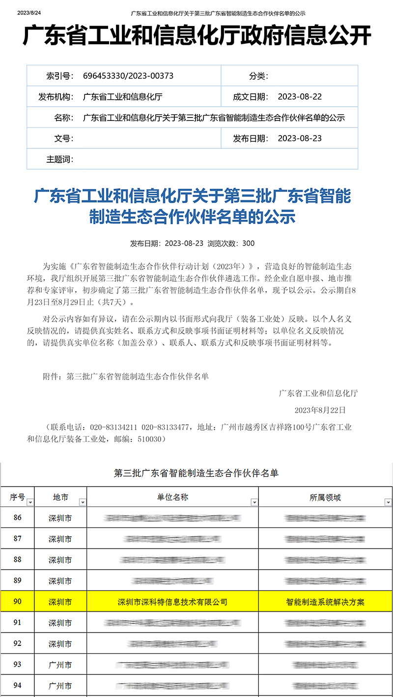 ? ? ? ?廣東省工業和信息化廳為實施《廣東省智能制造生態合作伙伴行動計劃(2023年)》,營造良好的智能制造生態環境,廣東省工業和信息化廳組織開展第三批廣東省智能制造生態合作伙伴遴選工作。深科特憑借優質的產品、服務和口碑,順利入選第三批廣東省智能制造生態合作伙伴名單