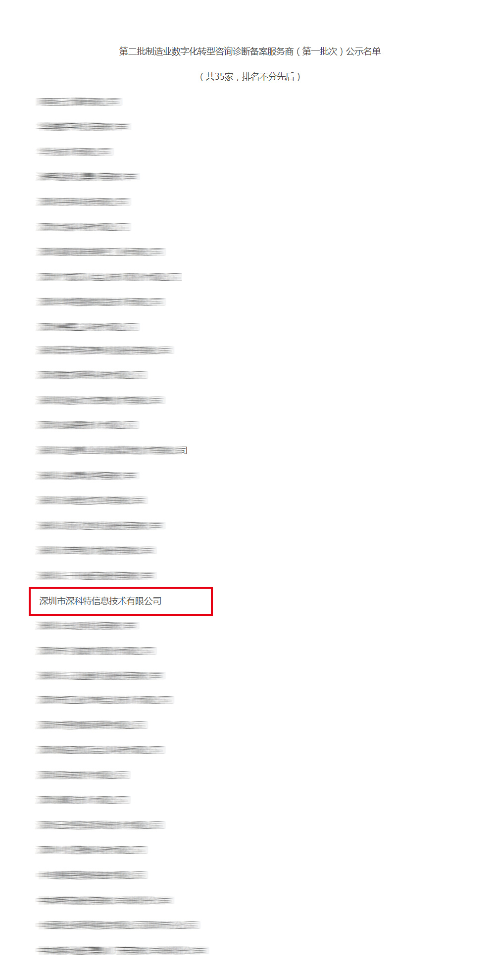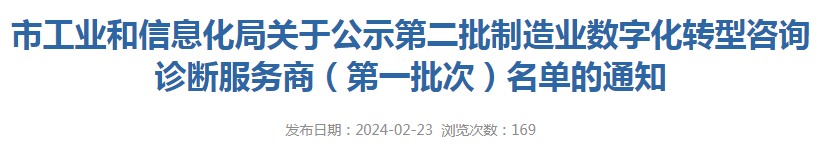 ? ? ? ?2024年2月23日,深圳市工信局公布了第二批制造業(yè)數(shù)字化轉(zhuǎn)型咨詢?cè)\斷服務(wù)商(第一批次)名單,深圳市深科特信息技術(shù)有限公司再次入選!入選備案服務(wù)商是對(duì)深圳市工信局專家評(píng)委對(duì)我司的高度認(rèn)可。深科特信作為國內(nèi)領(lǐng)先的MOM/MES解決方案提供商,將不忘初心,持續(xù)為制造業(yè)賦能,提升核心競(jìng)爭(zhēng)力。